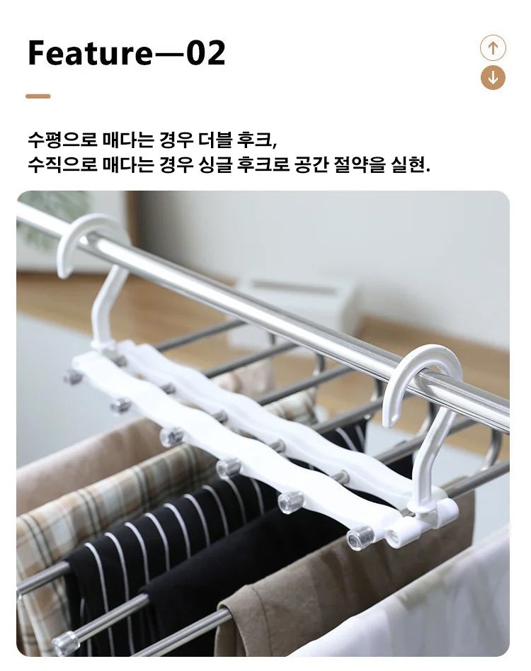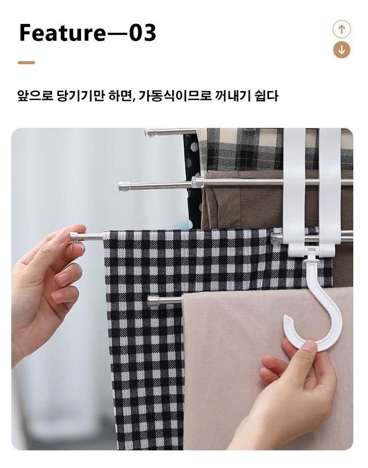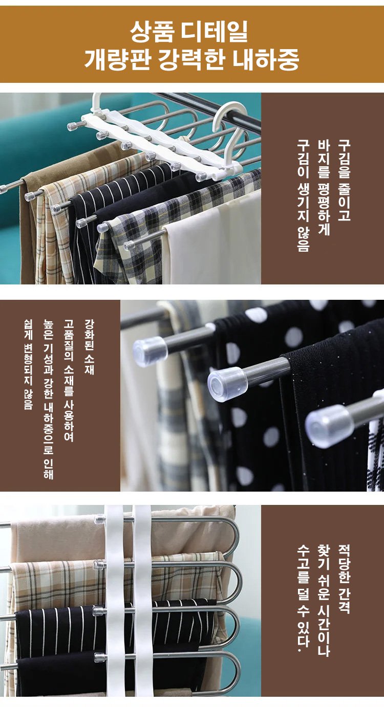 한번으로는 많은 바지 수납 가능, 깔끔하고 주름 방지, 행거는 자유 신축 가능, 가로, 세로 걸기 가능, 사용 편리, 한시 특혜